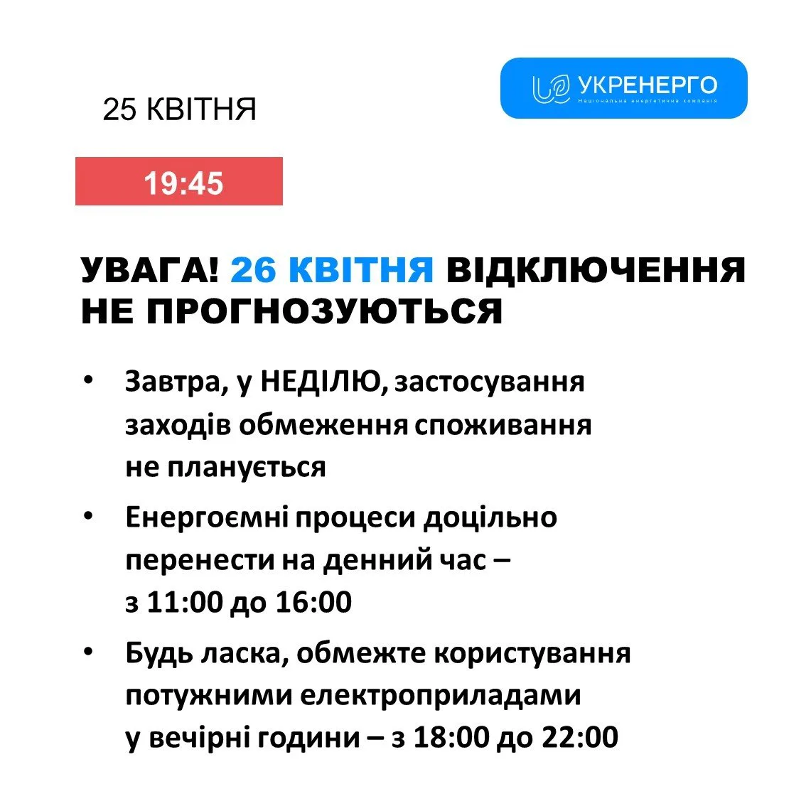 В Україні у неділю, 26 квітня, застосування обмежень електропостачання не планується. Про це повідомляє компанія "Укренерго", пише УНН.