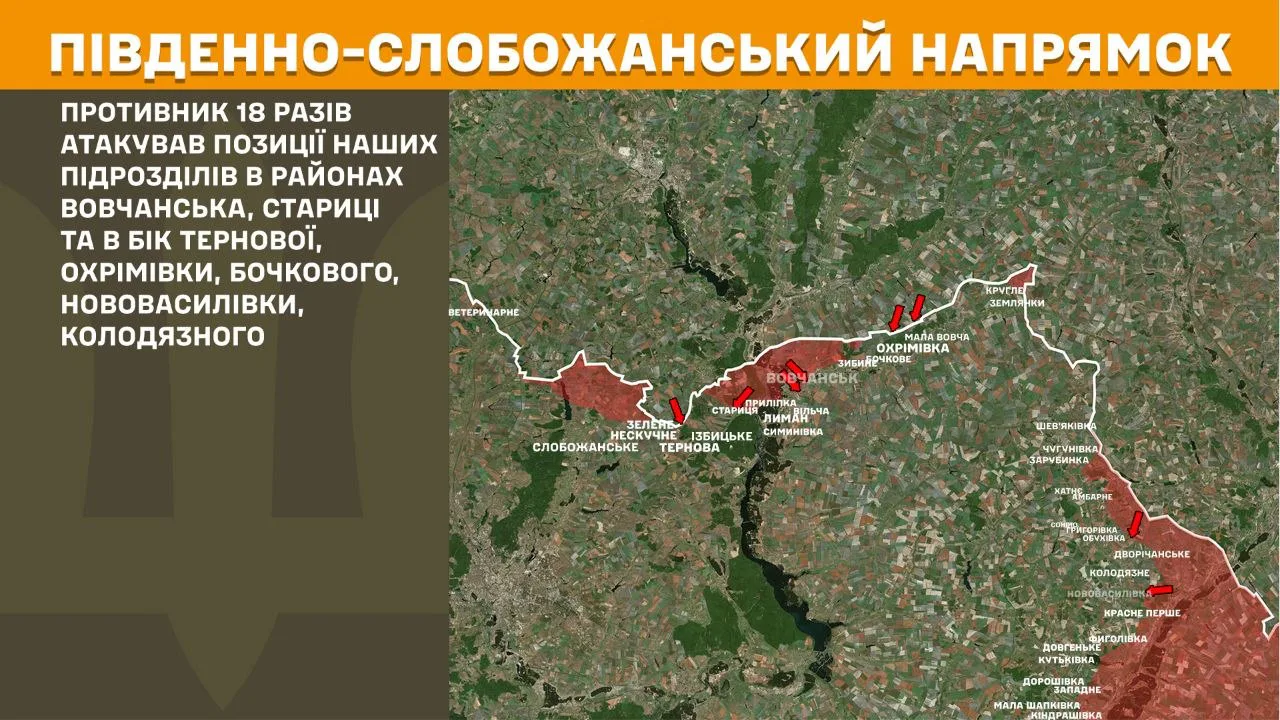 На Південно-Слобожанському напрямку противник 18 разів атакував позиції українських підрозділів в районах Вовчанська, Стариці та в бік Тернової, Охрімівки, Бочкового, Нововасилівки, Колодязного.